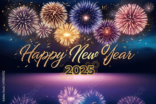 Vibrant New Year 2025 Celebration with Gold Text, Fireworks, and Glittering Confetti in a Dynamic Night Sky