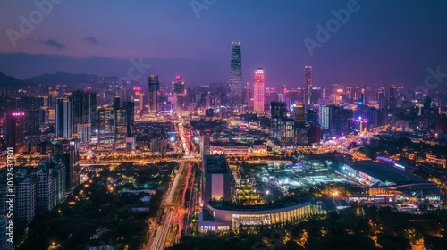 Vibrant Night Cityscape with Tall Buildings and Lights