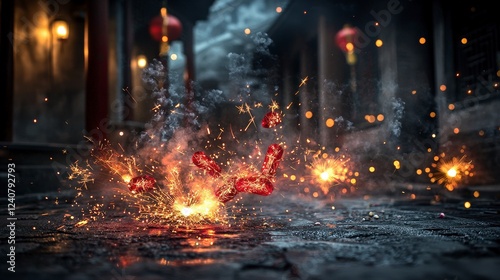 Vibrant night firecracker display historic alley photography urban environment close-up view celebratory concept