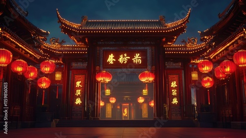 Vibrant Night Scene of Traditional Asian Architecture with Lanterns
