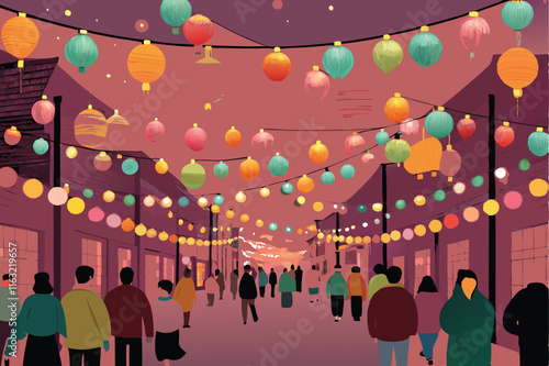 Vibrant night street scene brimming with colorful, illuminated lanterns strung across a bustling street, creating a festive atmosphere.