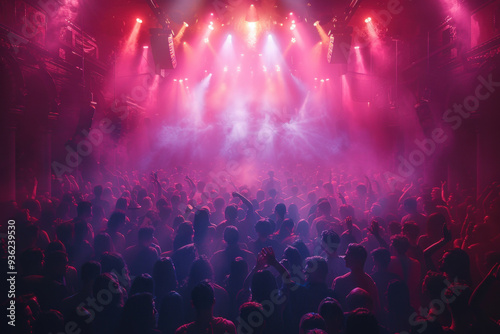 Vibrant nightclub scene with colorful lights and ecstatic crowd