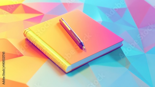 Vibrant notebook and pen resting on a colorful geometric surface.