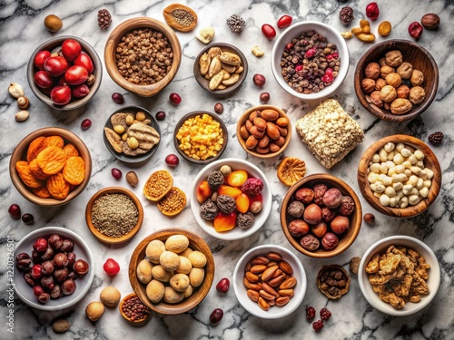 Vibrant nuts and dried fruits artfully arranged in bowls, photographed from above on a marble surface. Ample copy space.