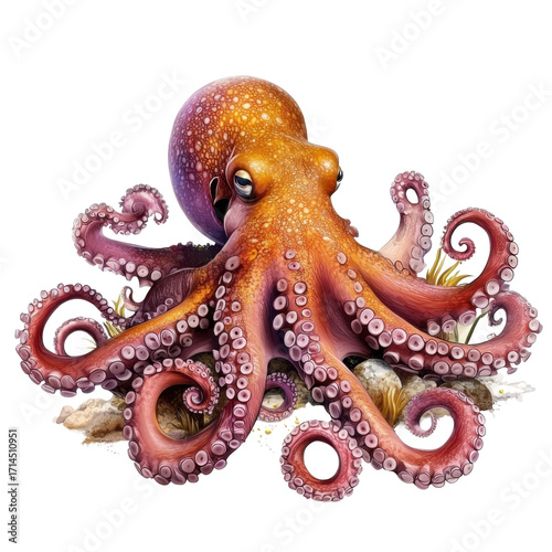 Vibrant Octopus Showcasing Tentacles and Texture in Underwater Habitat with Coral and Rock Background transparent background