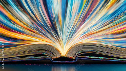 Vibrant Open Book with Abstract Light Trails Depicting Imagination and Knowledge Expansion