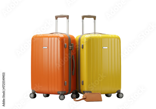 Vibrant orange and bright yellow hardside suitcases with extended chrome handles and a light brown leather travel tag on a seamless transparent background. Product showcase for travel luggage