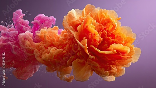 Vibrant orange and pink flowers in motion. Abstract ink-like swirls