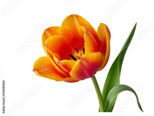 Vibrant orange and yellow tulip flower with green stem and leaves isolated on transparent background