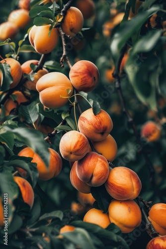 Vibrant orange apricot hangs from tree branch surrounded by rich green leaves. Fresh fruit grows in garden with natural backdrop of blurred gray. Perfect shot for food, nature, eco-themed projects.