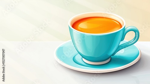 Vibrant orange beverage in turquoise cup on white surface, copy space
