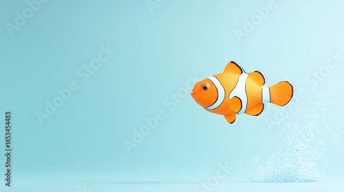 Vibrant orange clownfish swims in a serene blue ocean background