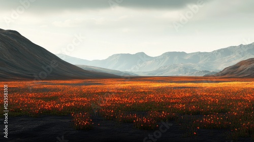 Vibrant Orange Flower Field in Scenic Mountain Valley Landscape