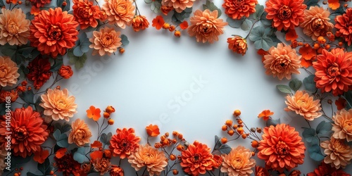 Vibrant orange flowers arranged in a decorative border on a soft blue background for an elegant display or invitation
