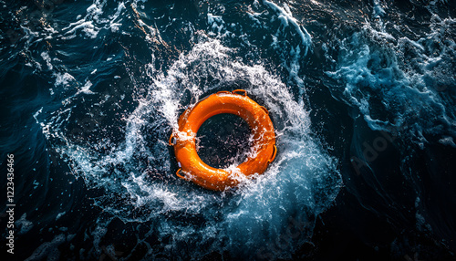 Vibrant orange lifebuoy amid turbulent ocean waves captures urgency and safety at sea