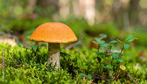Vibrant orange mushroom stands tall amidst lush green moss and small plants in a forest