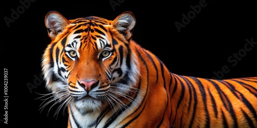 Vibrant orange tiger stripes on black background with bright studio lighting