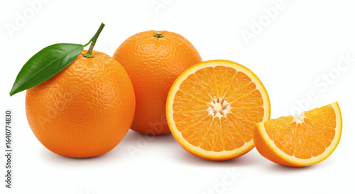 Vibrant Oranges: Whole, Halved, and Sliced with Leaf on White Background - Fresh Citrus Fruit Photography