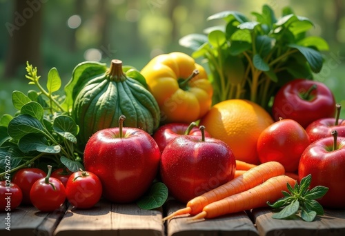 vibrant organic produce display rustic wooden surface showcasing fresh fruits vegetables vibrant colors varied textures, artisan, aesthetic, arrangement