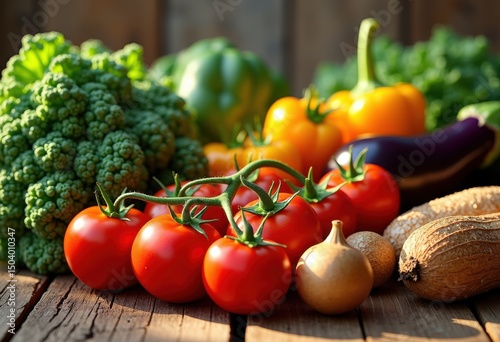 vibrant organic vegetables displayed rustic wooden table fresh harvest healthy choice colorful variety, natural, produce, diet, ingredient, plant, leaves