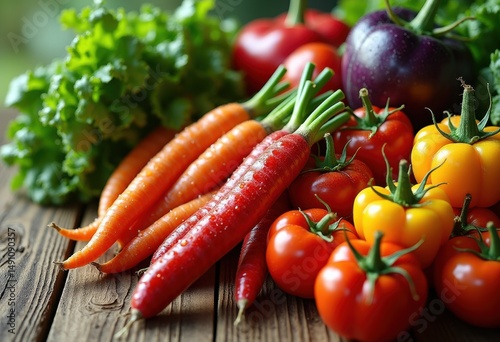 vibrant organic vegetables freshly harvested rustic wooden table displaying palette freshness, pepper, tomato, cabbage, carrot, lettuce, kale, zucchini