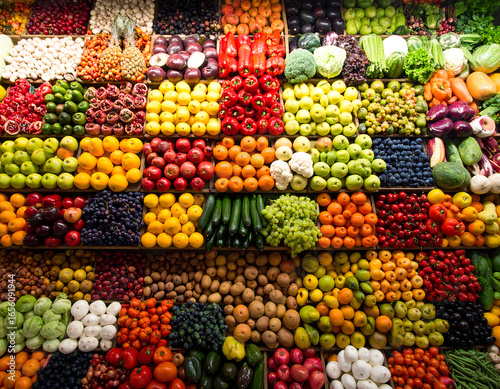 Vibrant overhead shot of colorful fresh produce arranged in wooden crates at a farmer's market, showcasing a variety of fruits and vegetables in a healthy and appetizing display.