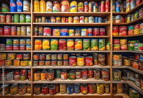 vibrant pantry shelves brimming colorful canned goods various shapes sizes, accessories, arrangement, artistry, bright, colors, containers, decor