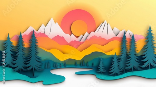 Vibrant Paper Art Landscape with Mountains, River, and Sun