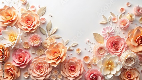 Vibrant paper roses in a soft pink and peach hue scattered across a plain white background, creating a beautiful and feminine textured look, texture, bohemian decor