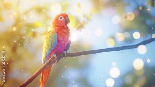 Vibrant parrot perched gracefully on a branch amidst soft bokeh lights