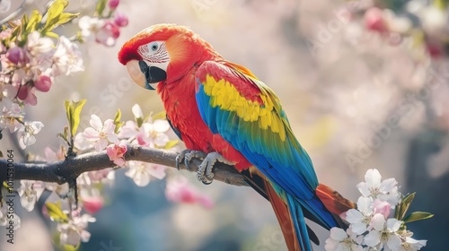 Vibrant parrot perched on blooming peach tree branch, embodying joy and prosperity, feng shui inspiration, colorful nature scene
