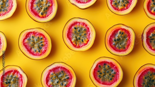 Vibrant Passion Fruit Halves on Bright Yellow Background Displaying Unique Textures and Colors