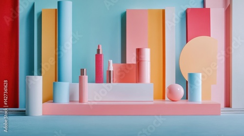 Vibrant pastel display of beauty products arranged artistically on circular podium against colorful geometric backdrop