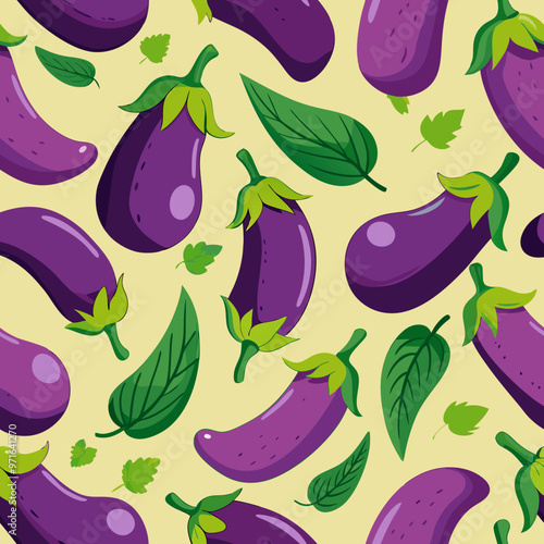 Vibrant pattern of eggplants and green leaves on a light yellow background for culinary design