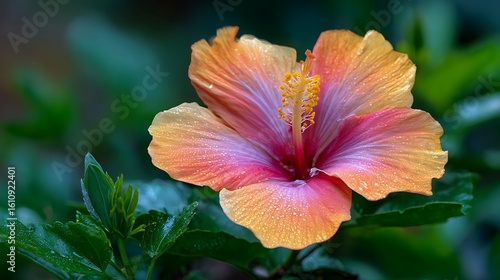 Vibrant peach and pink hibiscus flower with dewdrops on petals in soft focus garden