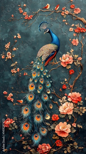 Vibrant Peacock Mobile Wallpaper Colorful Eyespots and Pink Roses on Dark Blue Background HD Aesthetic Design