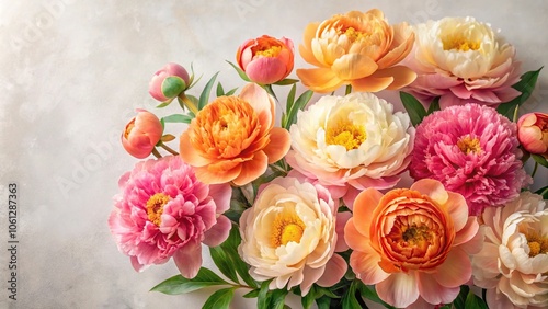 Vibrant peony flowers in shades of coral, salmon, and yellow on a white background with subtle texture, spring flowers, garden inspiration