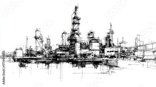 Vibrant photo of industrial complex with towers and pipes in black and white