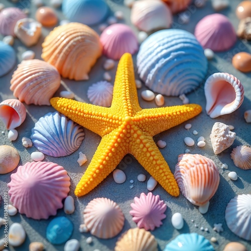 Vibrant photo shows starfish, seashells. Colorful seashells create summer beach scene. Pastel colors, perfect design for vacation projects, travel, coastal, holiday concept.