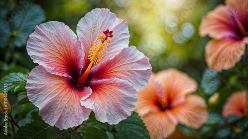Vibrant Pink and Orange Hibiscus Flower in Full Bloom with Green Leaves Background