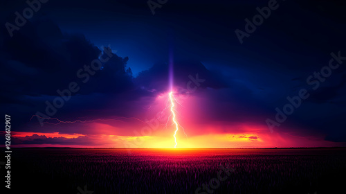 Vibrant Pink And Purple Sunset With Lightning Strike Over Field