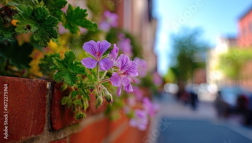 Vibrant pink flowers bloom from a brick planter, leading to a sunny urban street