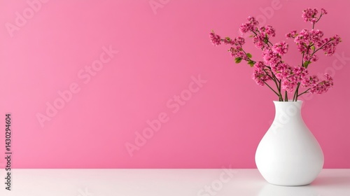 Vibrant pink flowers stand tall in vase against matching pastel wall, serene mood