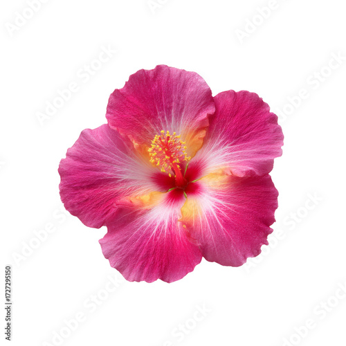 Vibrant Pink Hibiscus Flower with Soft Petals and Bright Yellow Stamen on a White Background