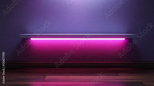 Vibrant Pink Neon Light illuminates sleek shelf on purple wall. AI Generated