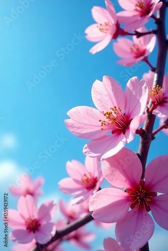 Vibrant pink sakura flowers against sky blue background, botany, beauty, nature