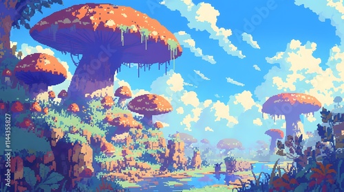 Vibrant pixel art fantasy game setting with oversized mushrooms, retro-inspired