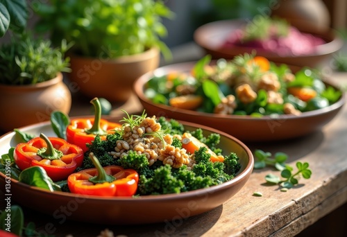vibrant plant based meals arrangement rustic wooden table natural colors healthy lifestyle culinary art, dish, vegetable, food, herb, leaf, ingredient