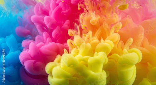Vibrant plumes of blue, pink, and yellow ink gracefully swirl and mix in water, creating an abstract and colorful liquid art display.