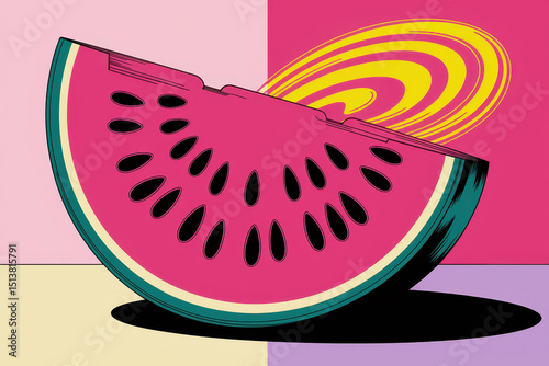 Vibrant pop art watermelon illustration with bold colors and abstract patterns